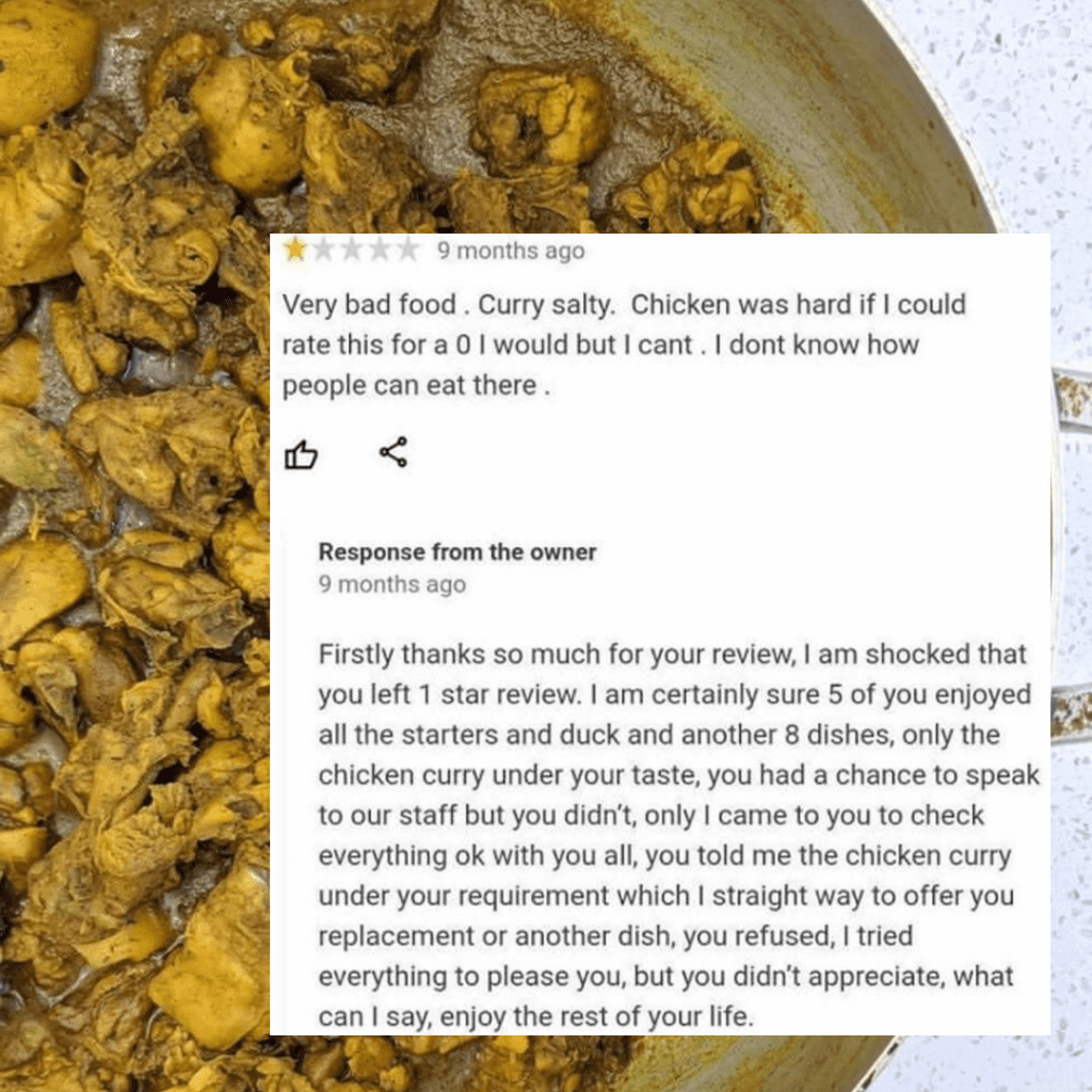 That’s exactly what happened above! Apparently, five people went to this Indian restaurant and they all ate about eight different dishes – not including the starters and a duck – but still left a one-star review over some salty curry!