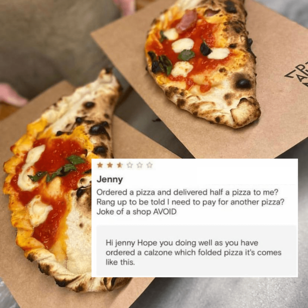 That’s exactly what happened here! Jenny ordered a calzone and then complained when she only got half of her “pizza.” The restaurant owner was quick to point out her mistake, though, which was super funny! Hopefully, Jenny learned something new today!