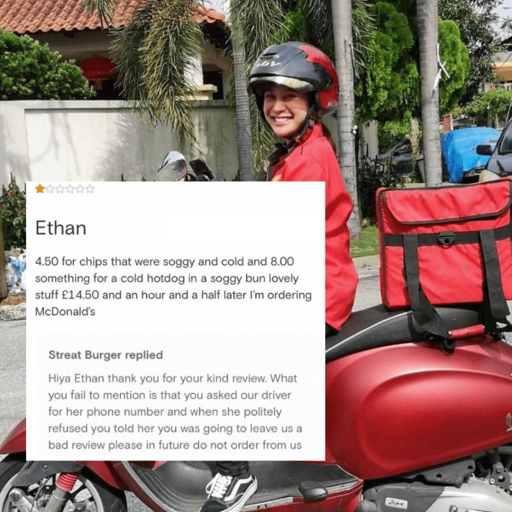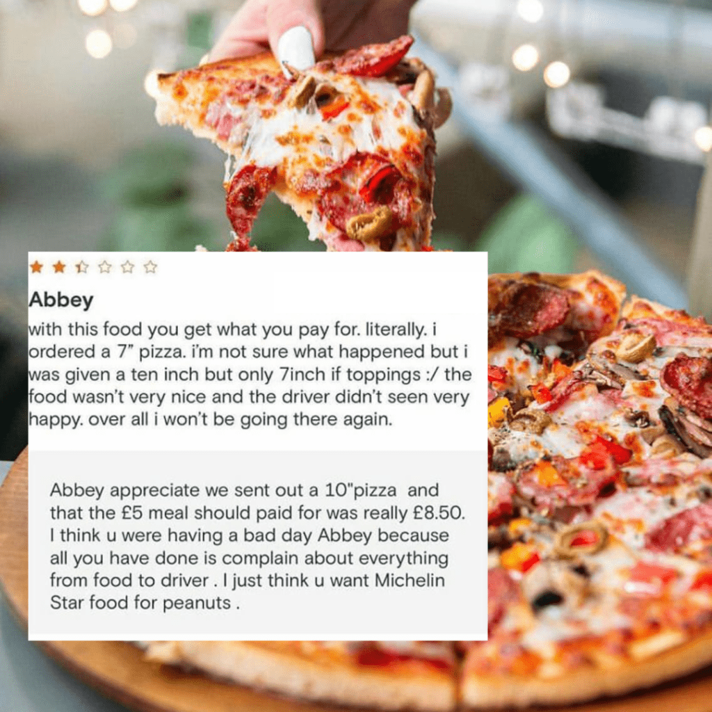 Quick lesson in manners: If you ask for a seven-inch pizza and get a ten-inch one, you don’t go around complaining about the toppings. Also, if you only paid £5 for your meal, you don’t get to complain about the taste or how upset the driver looked. Cheap food = cheap service!