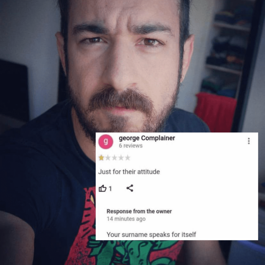 We’re pretty sure this guy’s surname is not really “Complainer,” but even the nicknames we choose to use online have power and represent us. So, when George here decided to leave a bad review online, the restaurant owner didn’t hesitate to use his nickname against himself!