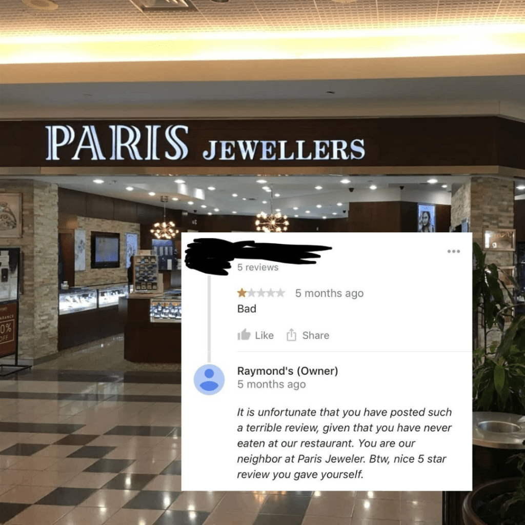 Also, it might be wise for this jewelry shop to use a burner account the next time they want to create fake reviews. Now the restaurant knows of their dirty tricks. It will make being neighbors very awkward. At this point, the only way forward is for one of these shops to move.